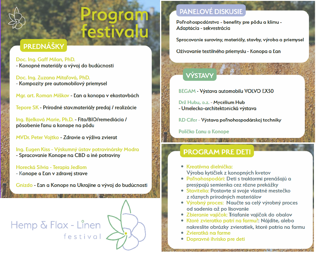 Príjmite pozvanie na prvý konopno-ľanový festival na Slovensku, kde Vás v areáli Družestva Cífer čaká zaujímavý program. Tešiť sa môžete na odborné prednášky o samotných plodinách ľan a konope ako aj o výrobkoch z nich a ich využití.