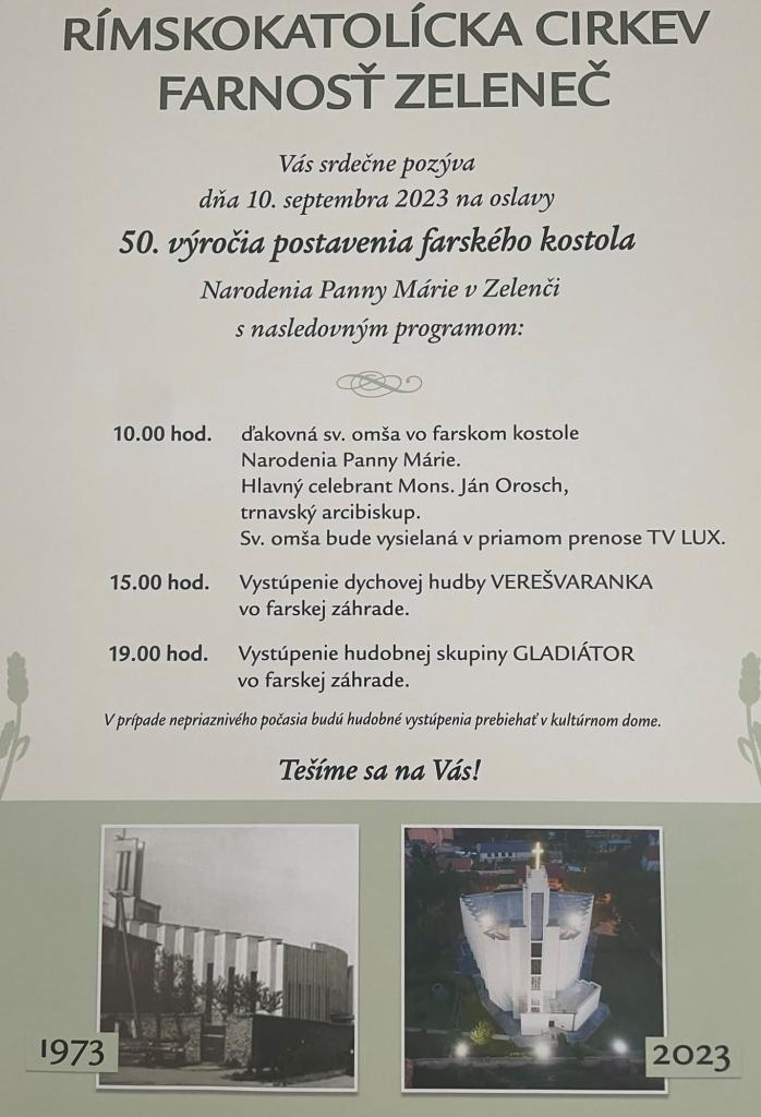 Tento rok /2023/ je 50. výročie postavenia farského kostola v Zelenči.